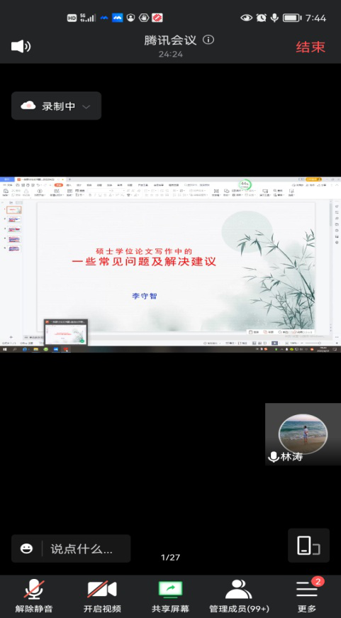 林涛教授向参会研究生强调了学位论文撰写和持续修改的重要性,并针对2021年校盲审论文的共性问题做了总结。要求研究生重视预答辩、送审、答辩等环节中的评审意见,根据这些评审意见对论文做深入细致的修改,确保学位论文质量。