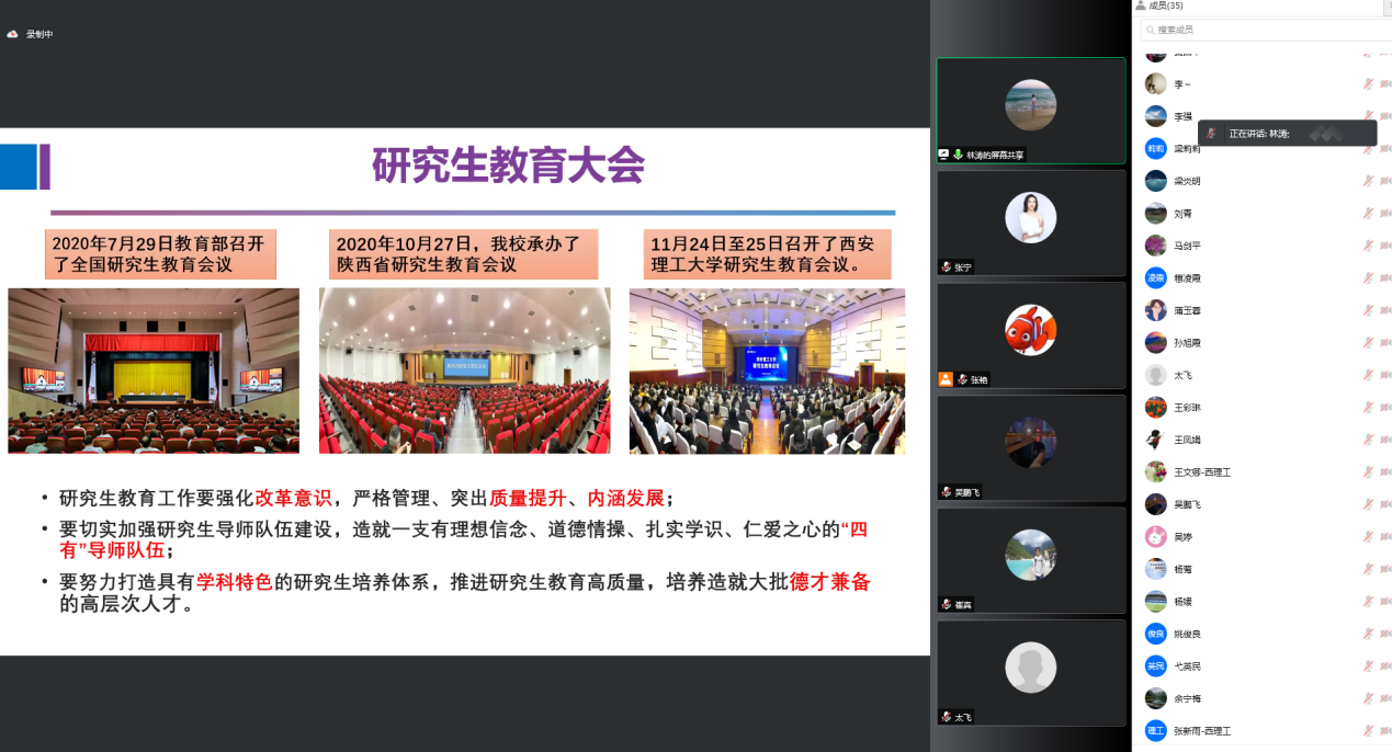 林涛教授根据2021年校盲审论文的评审数据,分析了公司研究生学位论文存在的一些共性问题,从论文的研究方法、创新性、写作规范性等方面做了总结。并结合近期研究生工作,要求各学科高度重视预答辩环节,各预答辩小组要认真把关员工论文质量,就研究内容、论文撰写、格式等提出具体可行的修改意见,以便员工修改完善;导师须督促研究生反复修改学位论文。