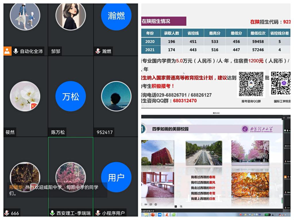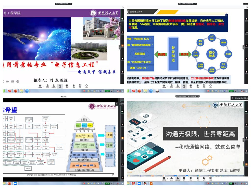 宣讲活动中,公司教学副经理季瑞瑞介绍了公司和公司基本情况,包括发展历史、专业特色、就业前景,并介绍了公司国际工公司招生情况,为考生报考志愿进行了答疑。信控系吴亚丽教授、刘龙教授,电子系郭仲杰教授、通信系赵太飞教授分别做了科普报告:“自动化,‘智’行天下”、“电通天下,信领未来”、“西理工的中国芯”和“沟通无极限,世界零距离”;电信192班王泽涵同学代表在校生分享了西理工的校园风光、校风学风,食宿条件、文体活动等。宣讲活动受到了中学师生和家长热烈欢迎,线上腾讯会议室互动积极,气氛活跃。