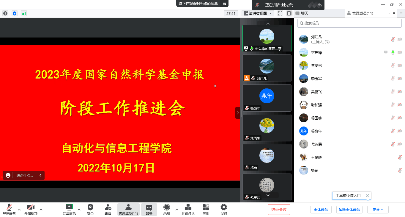 封先锋结合公司2022年国家科学基金工作总结暨2023年申报工作布置会的相关精神,从横向和纵向两个维度对比分析了公司基金申报工作面临的现状和存在的问题,介绍了公司基金申报工作的细化举措和月度工作任务。信控、电子、通信、三电中心四个教学单位依次汇报了本单位基金申报工作的开展情况和具体做法,并就相关问题进行了交流讨论。