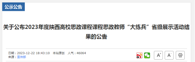2023年度陕西省高校思政课程课程思政教师“大练兵”省级展示活动近日落下帷幕,经过反复演练和精心打磨,通过网络初评、现场展示等环节,公司电子工程系刘静老师获课程思政“教学能手”荣誉称号。