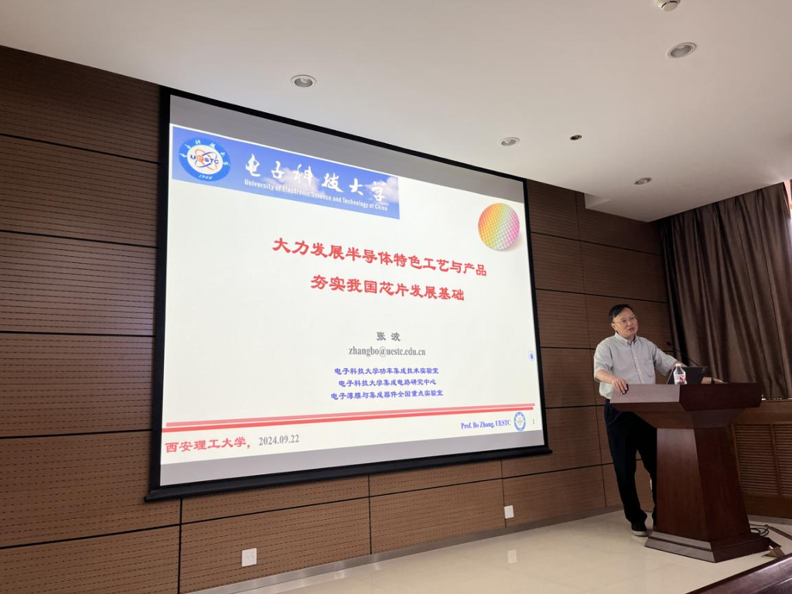 张波教授做了题为《大力发展半导体特色工艺与产品,夯实我国芯片发展基础》的报告,从半导体特色工艺角度对摩尔定律做了全新的阐释,指出发展半导体特色工艺与产品是我国当前芯片产业发展的契机和突破口,并勉励参会青年学子刻苦钻研,积极投身我国芯片行业建设。