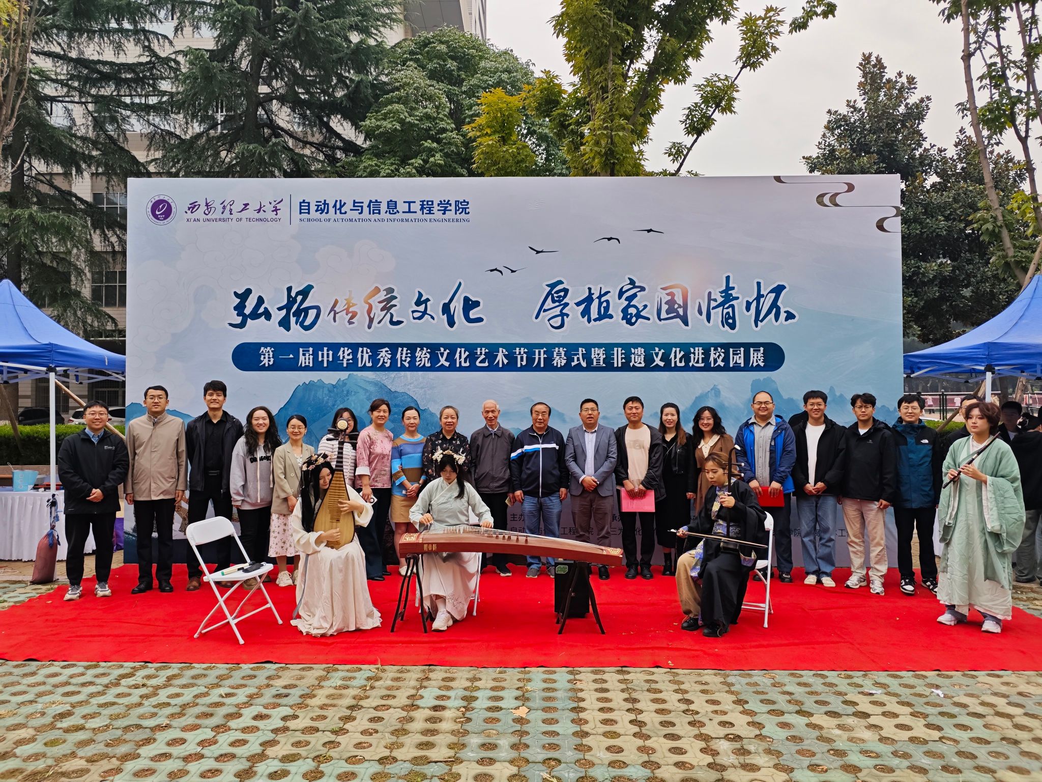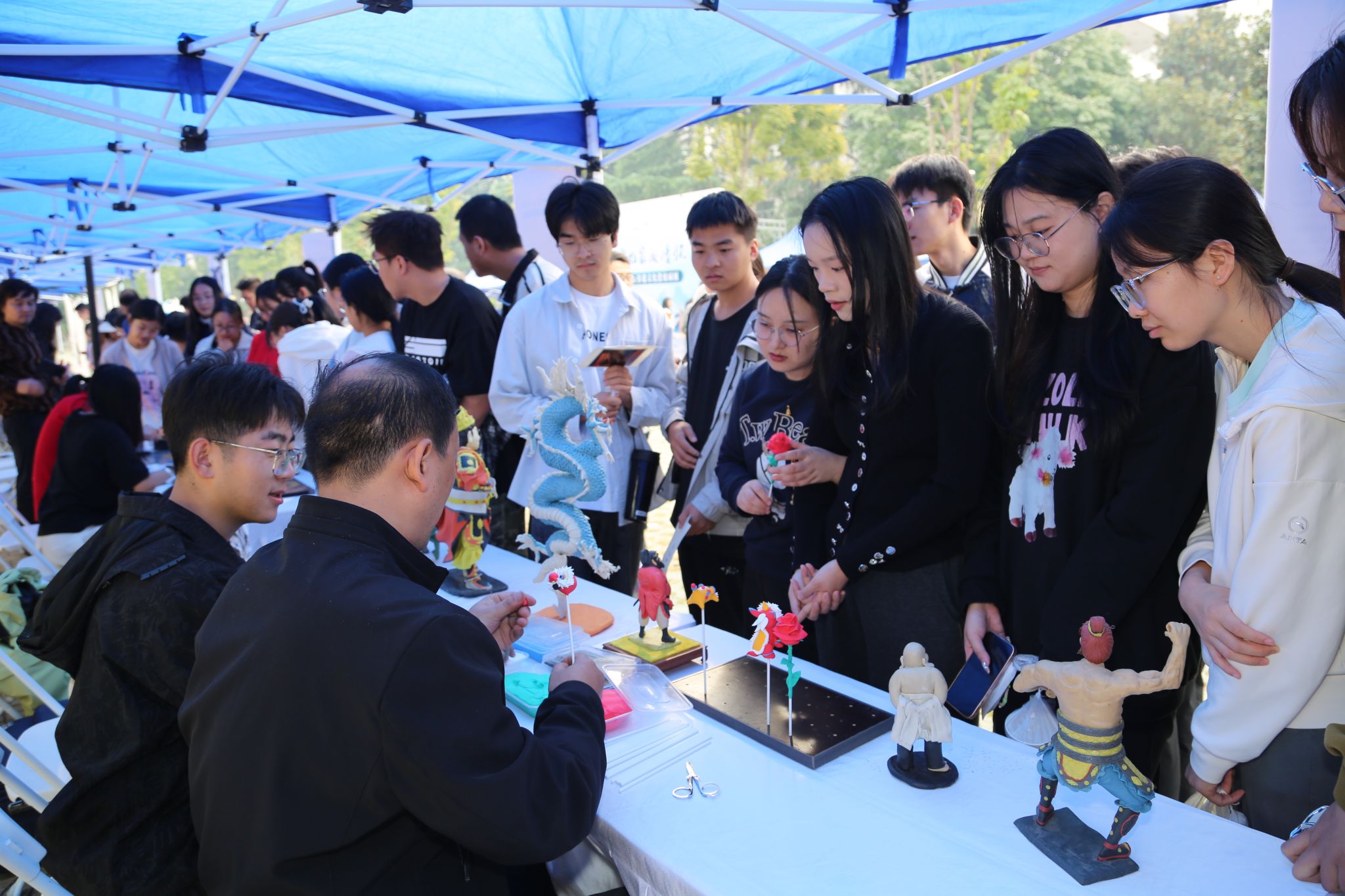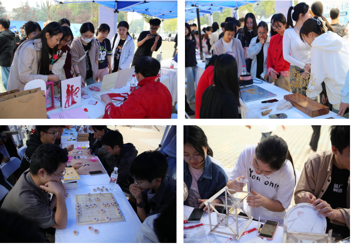 在活动现场,在非遗传承人展区中,六位非遗传承人分别展示了绣样剪纸、长安面塑技艺、糖画、鱼化泥叫叫、秦腔脸谱、非遗蛋雕等非遗手工艺品。在小山文化园展区、汉服体验区、书画展区、民乐区与文化互动区中,师生们从不同角度感受了中华优秀传统文化。在艺术展区,朱富帅老师和王二盟老师向师生们展示了雕塑文化和木作文化。