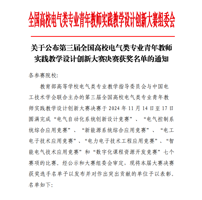 11月14-17日,第三届全国高校电气类专业青年教师实践教学设计创新大赛决赛在徐州工程公司成功举办。自动化学院青年教师郭鑫、程刚在“电气自动化系统创新设计竞赛”赛项中,凭借作品“智能电气综合实践平台开发与面向工程应用教学案例设计”获得“电气自动化系统创新设计竞赛”赛道全国二等奖。