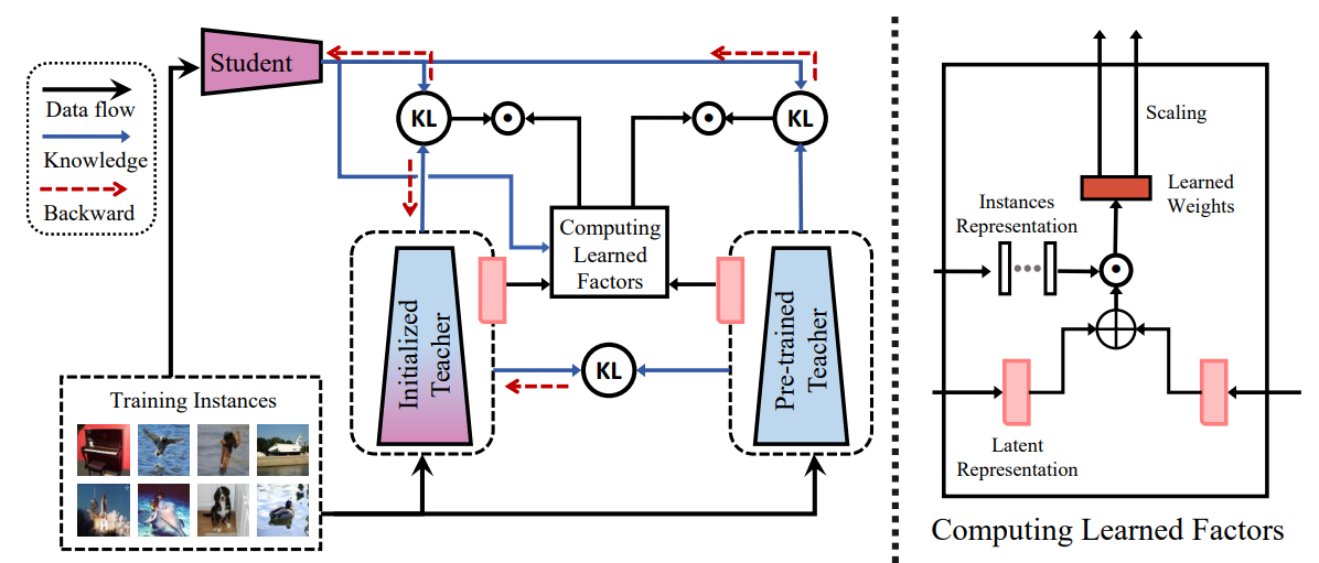 为解决上述问题,本论文提出了一种自适应双重引导知识蒸馏 (Adaptive Dual Guidance Knowledge Distillation, ADG-KD)。ADG-KD在保留预训练教师的基础上,额外引入了一个与预训练教师同构的初始化教师模型。该初始化教师模型在预训练教师模型与员工模型的双向监督下进行优化,从而构建出教师网络的双向优化路线。在蒸馏过程中,员工模型在预训练教师模型及其双向优化路线的自适应双重引导下进行优化,以学习到准确的知识表征以及与其表征能力相兼容的知识序列。广泛的实验表明,本论文提出的方法能够有效解决容量沟壑问题,并促使员工模型取得与教师模型相近的性能。