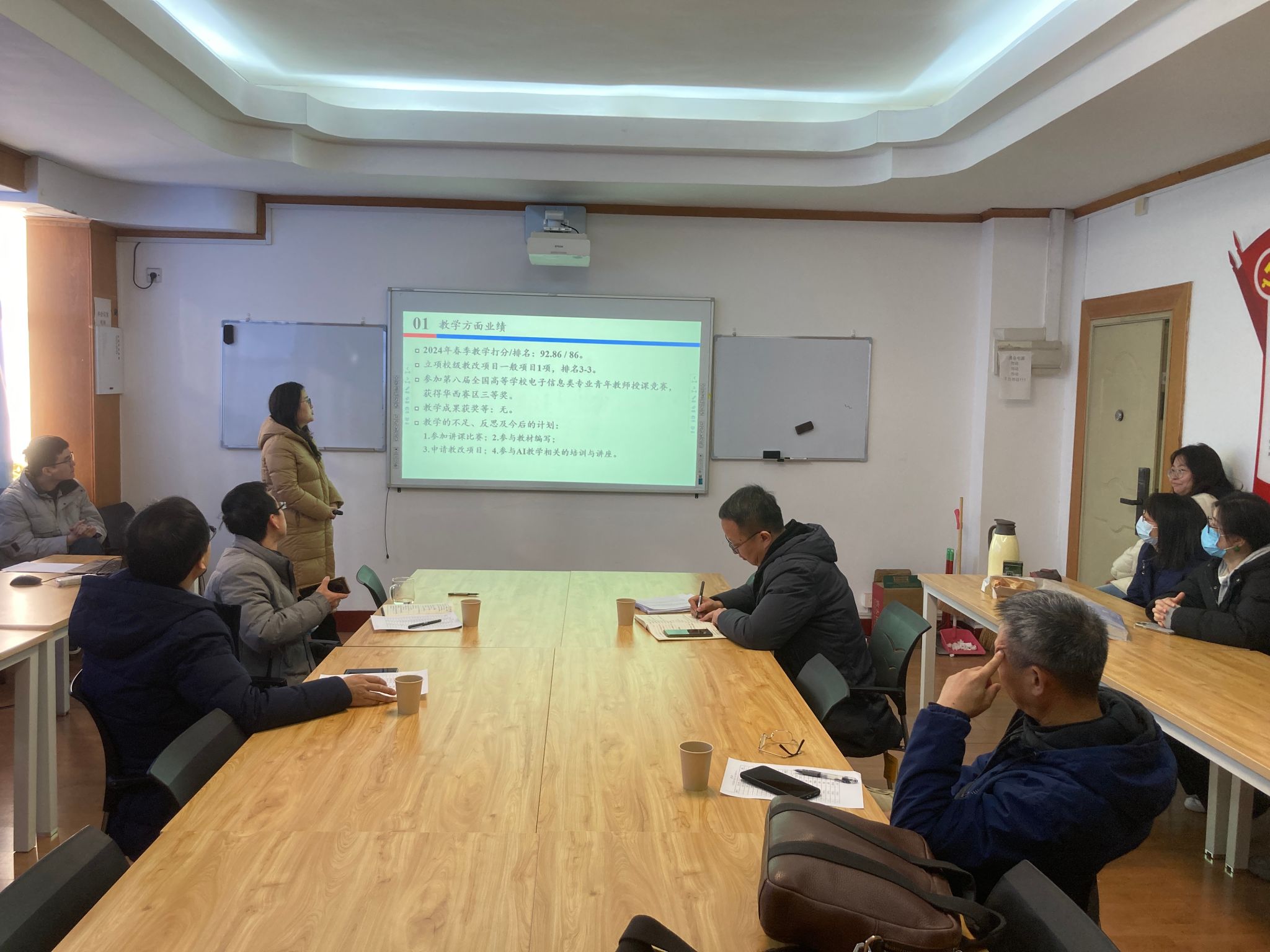 在汇报会上,青年教师们围绕教学与科研两大核心领域,对 2024 年度的工作进行了全面的总结。在教学方面,他们从教学效果、教改项目、教学竞赛获奖与教学成果获奖情况入手,坦诚地剖析了不足,并结合教学实践进行了深刻反思,制定了切实可行的改进计划。科研业绩方面,青年教师着重汇报了标志性成果的产出情况、参与学科评估、实验室评估以及国家重大项目、教学科技奖撰写的情况,展示了一年来的科研进展和成果,同时也反思自身存在的短板。