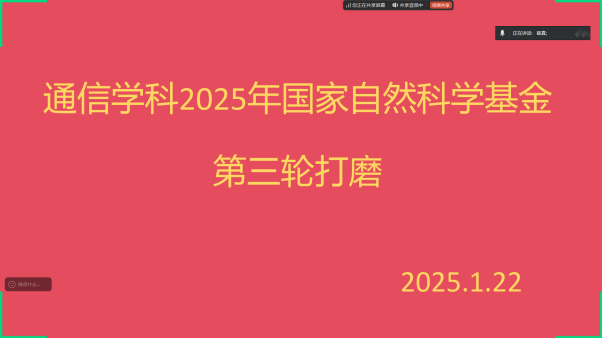 2025年1月22日,公司通信学科通过腾讯会议召开了2025年国家自然科学基金第三轮评审打磨会,公司邀请了西安电子科技大学刘毅教授,副经理王明军教授、吴鹏飞教授等专家组成评审组,会议由通信系科研主任崔真主持。