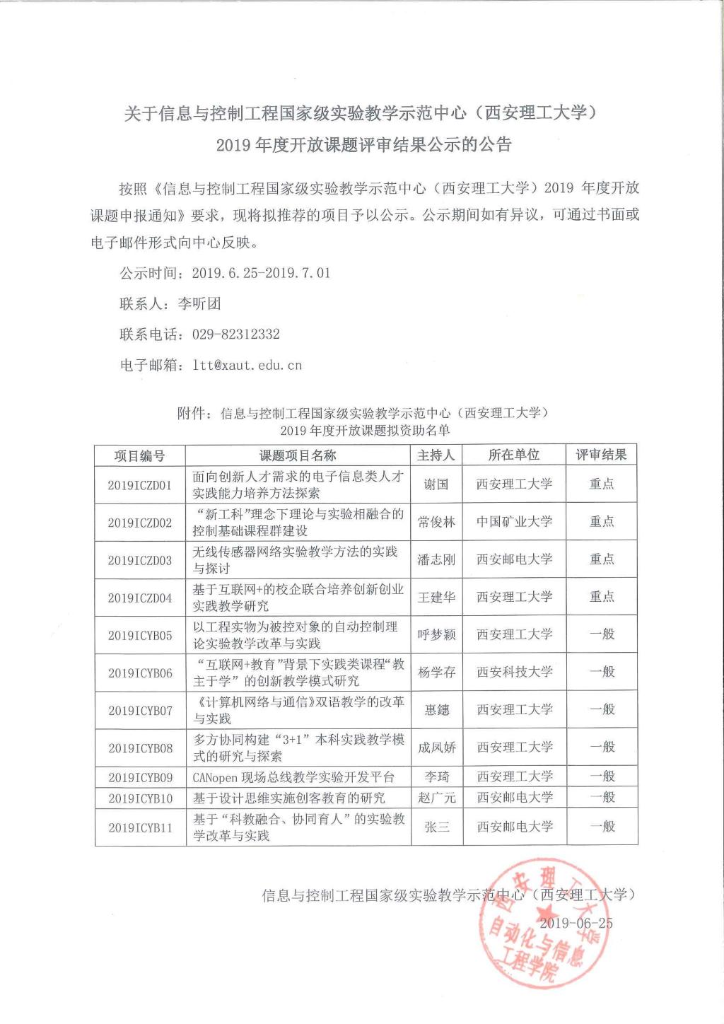 关于信息与控制工程国家级实验教学示范中心(伟德国际唯一官网)2019年度开放课题评审结果公示的公告