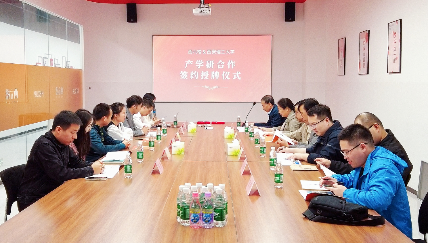 会上,侯帆对校方一行的到来表示热烈欢迎,并就公司的发展历程、企业文化、产品结构和产学研需求等情况进行了介绍。王俊辉对侯帆等员工的创业成绩进行了肯定,并邀请侯帆等常回母校为在校学子分享创新创业经验。季瑞瑞表示本次协同育人基地的建立将开启一个双赢新局面,校企双方深度协同优势互补共同推进科技创新和人才培养,进一步探索校企合作长效机制。会上双方签署了合作协议,王俊辉向西安奔云信息科技有限公司授予产学研合作协同育人基地铜牌。随后,侯帆带领到访师生参观了公司的实验室与中试车间,向师生详细介绍了公司的产品研发、生产流程,到访师生与侯帆等进行了热烈的互动交流。